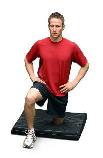 4. Begin with your stretch leg in a kneeling position and the other leg bent at a 90-degree angle.  To start the stretch, tighten your gluteus maximus and rotate your pelvis under while maintaining an upright posture.