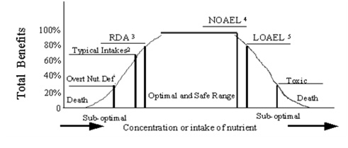 Figure 1 illustrates how, within a wide range of safety, the amount of a nutrient required to achieve optimal benefits in performance and health can be approximated. As the concentrations of nutrient intake increases, different levels of biological function (total benefits) are approached.