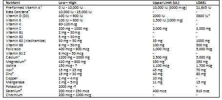 Cautious review of existing information following the criteria in Figure 1 suggests total nutrient intake to fall somewhere within the ranges shown in Table 1. Any nutrient not appearing in the table indicates that too little information exists to establish a range. Therefore, consuming a balanced diet will presumably meet the currently known need. These totals include the nutrient content of food intake and supplementation. Considering most nutrient ranges shown in Table 1 fall well within known safety margins and the often small contribution food makes to most of these desired levels, it would generally not be necessary for individuals to compile the nutrient content of daily food intake. Respecting this, daily supplementation should be no higher (maybe lower when marked) than the upper amount listed, which is commonly well below the tolerable upper limit. More active individuals may maintain intakes closer to the higher side of the range. Recently, it has been proposed that the age and gender of an adult determines the appropriate levels of certain nutrients.