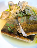 As needed for service, ladle 3 oz broth in each serving dish. Place 2 oz chard in Center. Top with 1 fillet. Place 3 leaves endive to the side.