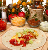 Heat nonstick skillet and cook egg and onion.  When eggs are almost cooked drop in pieces of cheese or cream cheese.  Place tortilla over the eggs in the skillet to warm.  Remove the warm tortilla, roll with scrambled egg mixture, and salsa.