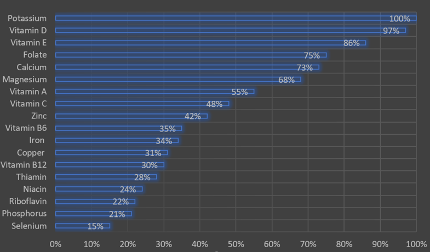 Here’s a snapshot from the U.S.D.A. and the Dietary Guidelines for Americans which revealed the percentage of people who fall short of the listed vitamins and minerals: