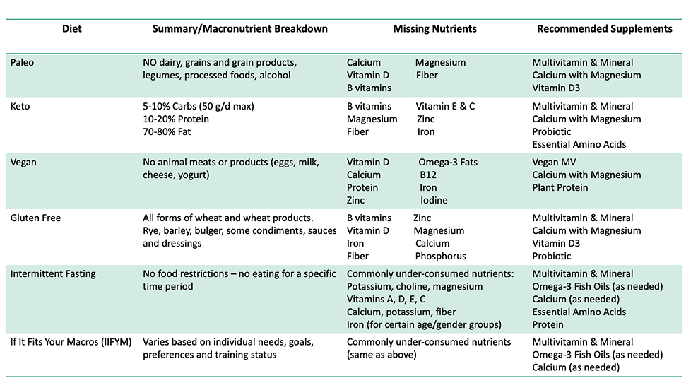 It’s risky and counterproductive to follow a weight loss diet to improve your health while simultaneously increasing the risk for chronic diseases.  If you’re following a weight loss diet, be sure to get the nutrients you’re missing to support your health and longevity. The table below includes some common popular diets.